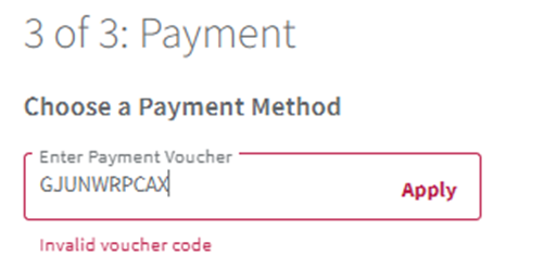 Invalid codes will display the “Invalid voucher code” message shown below.