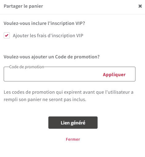 Cliquer sur Partager ce panier, cocher la case Ajouter les frais d’inscription VIP et inscrire tout code promotionnel applicable. |